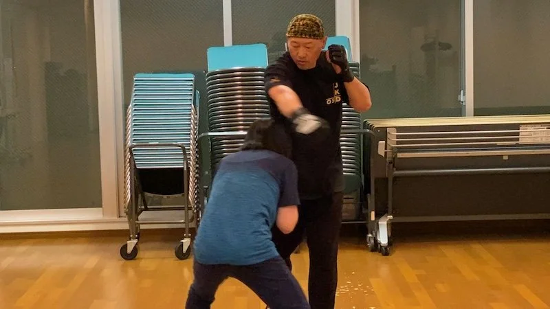 プライベートレッスンの様子、インストラクターがランダムにパンチやキックを出し、それに反応して体捌きのみで攻撃をかわすトレーニング法